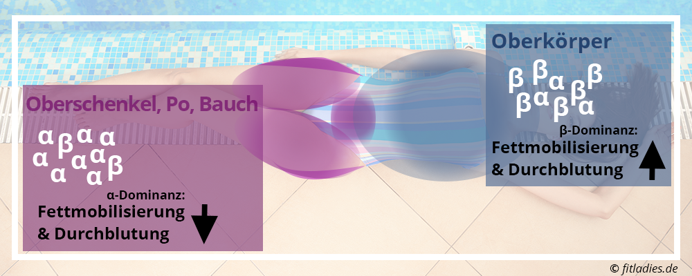 Problemzonen haben einen hohen α2-Rezeptor-Anteil: Das Fett an Oberschenkeln, Po und Hüfte zeichnet ein hoher α2-Rezeptor-Anteil aus. Zum Teil hat das Fett an diesen Stellen 9 mal mehr α2-Rezeptoren als β2-Rezeptoren!