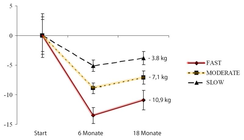 Die Teilnehmerinnen wurden je nach anfänglicher Abnahmegeschwindigkeit in die Gruppen FAST, MODERATE, und SLOW eingeteilt. Nach 6 Monaten lag die Gewichtsveränderung jeweils bei −13,5 kg, −8,9 kg und −5,1 kg (siehe auch Abb. 2).