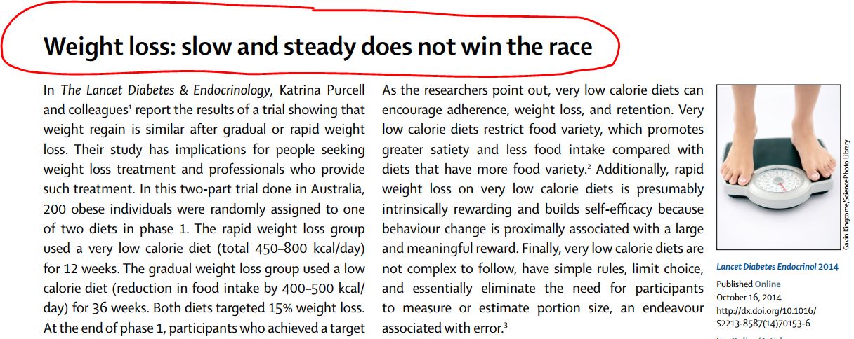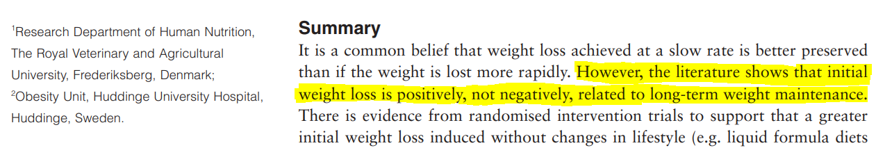 Aber selbst, wenn diese Beobachtungsstudien keinen sicheren kausalen Zusammenhang zeigen können: Nichts deutet bislang in die Richtung, dass man allen Menschen dringend langsames Abnehmen empfehlen müsste oder dieses generell „besser“ wäre. Wenn überhaupt zeigen die Ergebnisse konstant in die gegenteilige Richtung, was auch in anderen Untersuchungen bestätigt wird. (Elfhag 2015, Wadden 1992, Jeffery 1998, Aastrup 2000, Stotland 2005).