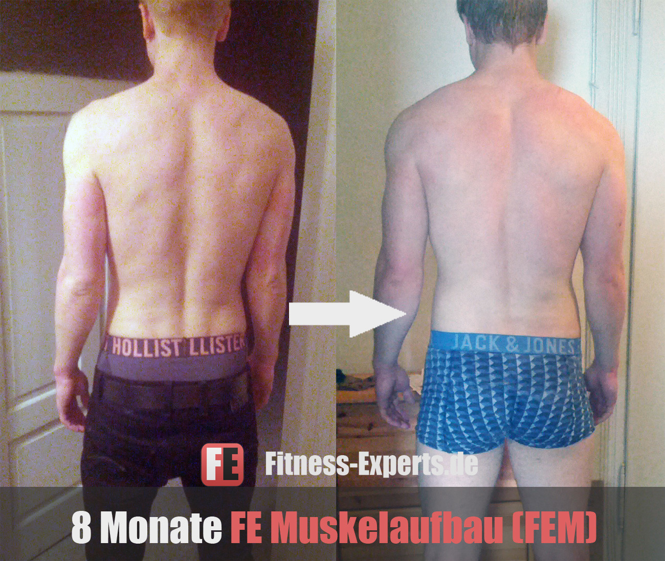Innerhalb von 8 Monaten hat Max 8 kg Muskelmasse aufgebaut. Dafür hat er den FEM wie vorgegeben in allen Phasen durchlaufen und am Ende eine Mini-Diätphase von 2,5 Wochen eingelegt.