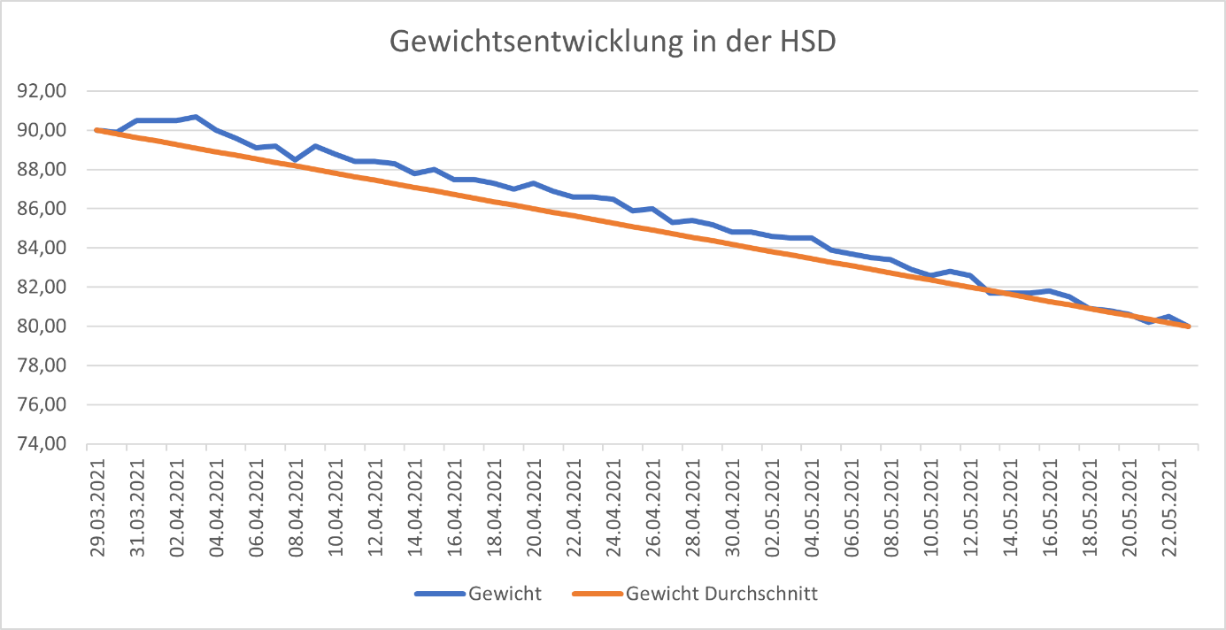 Am Anfang musste ich etwas austesten, wie ich die Mahlzeiten über den Tag am besten verteile, letztendlich war ich mit einem leichten Frühstück in Form von Skyr mit Aromatropfen und einem, wie ich finde sehr üppigen Mittagessen gut bedient. Da ich keine Abendessen hatte, hat sich automatisch noch das intermittierende Fasten mit in die HSD integriert von ca. 18/6, inwieweit das einen zusätzlichen Effekt hatte, kann ich nicht beurteilen, tat mir aber gut.