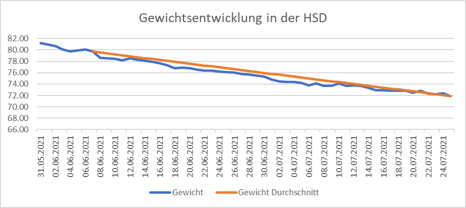 Nach der 1. HSD wog ich 80 kg, hatte einen BMI von 29,4 und hatte die Adipositas Grade erfolgreich hinter mir gelassen und war nun „nur noch“ übergewichtig. Eine wunderbare Entwicklung Richtung Gesundheit und Wohlbefinden.