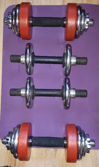 Viel Equipment hatte ich auch nicht zur Verfügung, nur ein paar Kurzhanteln mit wenig Gewicht. Glücklicherweise wurden mir aus meinem privaten Umfeld noch ein paar Gewichte geschenkt, nachdem sich herumgesprochen hatte, dass ich da noch was brauche.