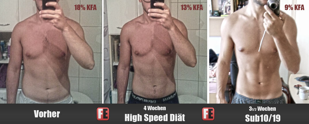 Um dann unter 10% zu kommen, hat Patrick unsere Sub10/20 Diät angewandt. Darin geht es darum, wie man die letzten kg Fett verliert. Oder genauer: wie Männer unter ca. 10% KFA kommen und Frauen unter ca. 20%.