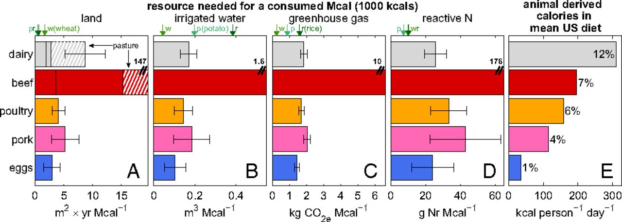 Rindfleisch erzeugt im Vergleich zu Puten- und Schweinefleisch 5x bis 10x mehr Treibhausgase.3Eshel G, Shepon A, Makov T, Milo R. Land, irrigation water, greenhouse gas, and reactive nitrogen burdens of meat, eggs, and dairy production in the United States. Proc Natl Acad Sci U S A. 2014 Aug 19;111(33):11996-2001. doi: 10.1073/pnas.1402183111. Epub 2014 Jul 21. PMID: 25049416; PMCID: PMC4143028.