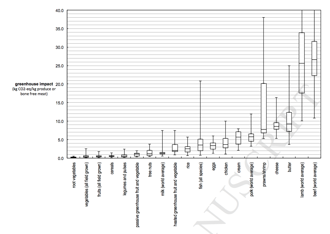 Auch Obst & Gemüse aus beheizten Gewächshäusern liegen in diesem CO₂-Bereich.4Clune, Stephen & Verghese, Karli & Crossin, Enda. (2016). Systematic review of greenhouse gas emissions for different fresh food categories. Journal of Cleaner Production. in press. 10.1016/j.jclepro.2016.04.082.