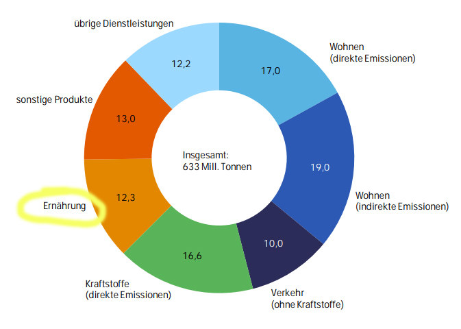 Die Ernährung verursacht damit ~15 % unseres persönlichen CO₂-Ausstoßes. 85 % kommen aus anderen Quellen (siehe Abb 1.).2Direkte und indirekte CO₂-Emissionen in Deutschland (Statistisches Bundesamt)