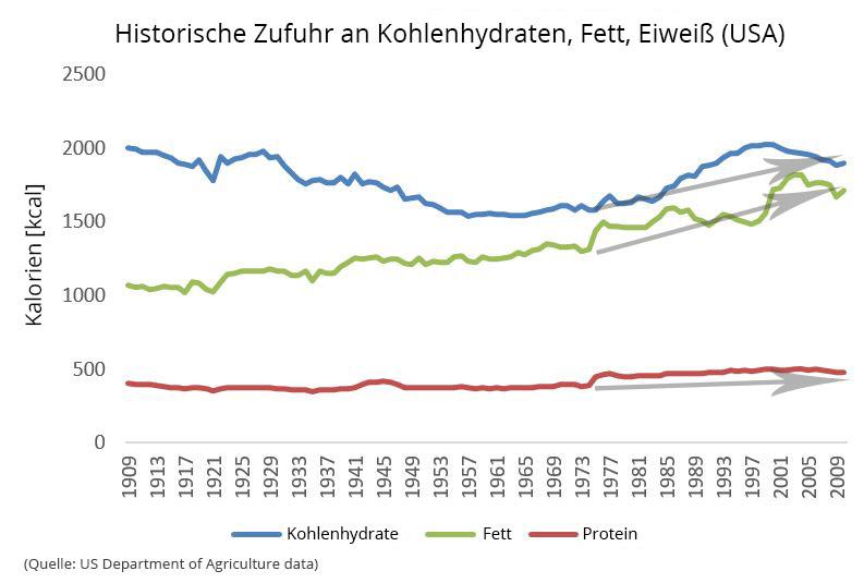 Auch hier ist neben zurückgehender körperlicher Bewegung schlicht eine höhere Kalorienzufuhr am Werke (siehe Bild). Von allem konsumieren wir heute mehr, vor allem von Fett UND Kohlenhydraten.