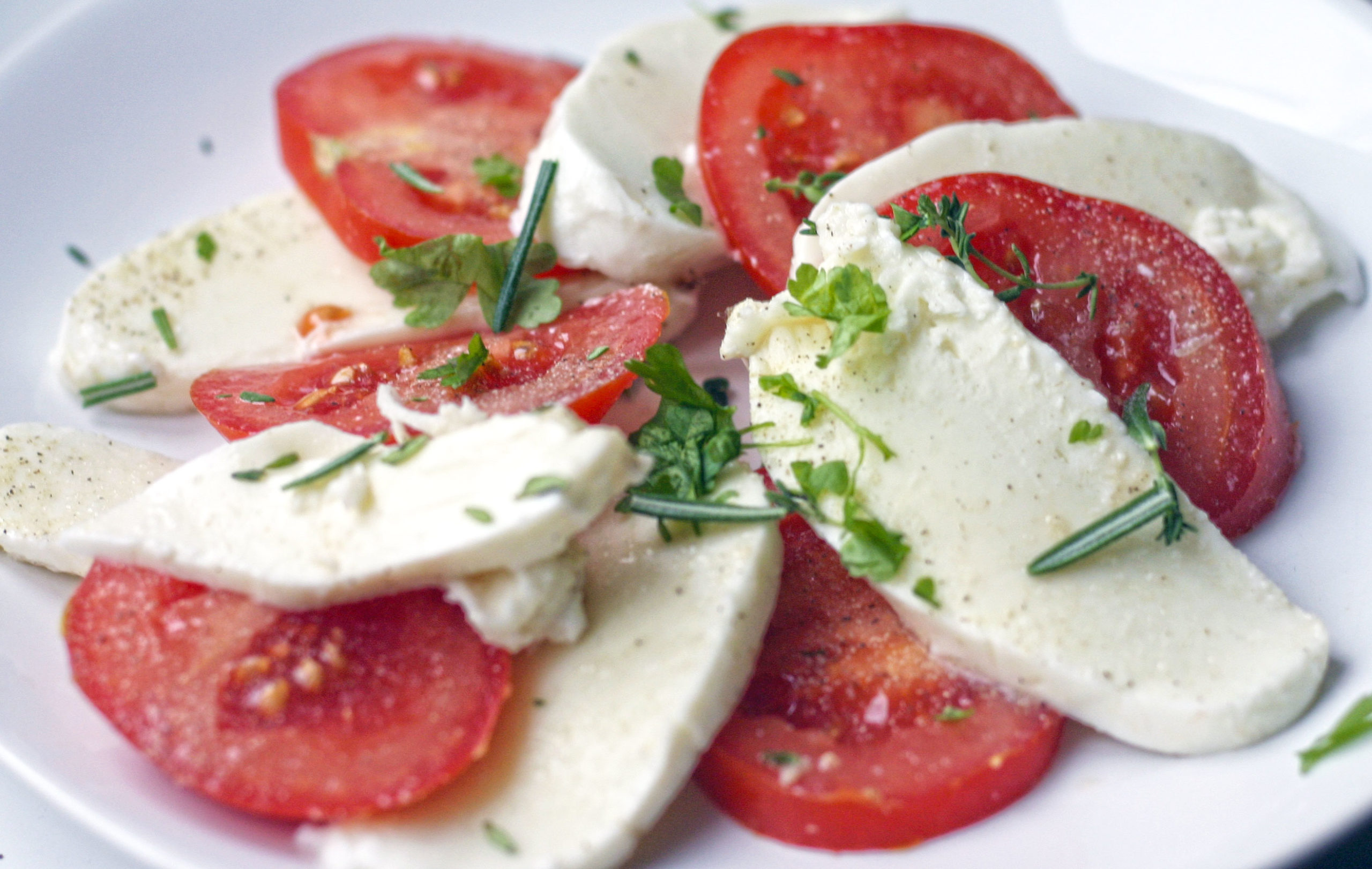 1 Mozarelle (125 g) und 2 Tomaten in Scheiben schneiden.