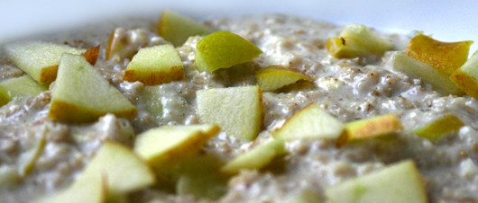 Von der Platte nehmen. Proteinpulver einrühren. Apfel kleinschneiden und hinzugeben.