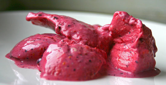 Alles in den Mixer geben oder mit dem Stabmixer zerkleinern – fertig. Die Beeren sollten tiefgekühlt und die Milch auf Kühlschranktemperatur gekühlt sein. So ergibt sich nach dem Mixen eine weiche Eiskonsistenz.