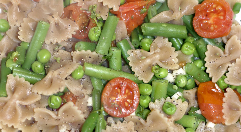 Sobald das Wasser kocht, Pasta, Gemüse und Tofu in das Wasser geben. Es eignen sich verschiedene Pastasorten: Spaghetti, Penne, Spirali etc. –